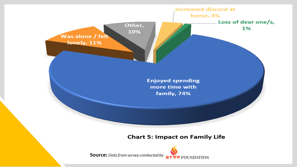 One of the most evident shifts because of the pandemic, is change in work format to ‘work from home’ and more than half the respondents have even found it more productive and enjoyable (Chart 4). However, around 8% of our sample group were unable to work and more than a fifth felt the stress of a new work culture, which has blurred the lines between work and family life.